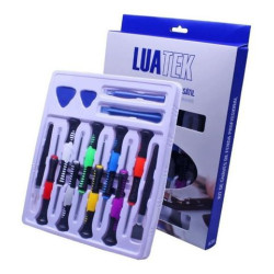 Conjunto composto por 16 peças, como chaves Torx, Philips, em Y, paletas, espátulas, pinça e estilete, indicados para realização de manutenção em aparelhos, como smartphones, tablets, notebooks e etc.